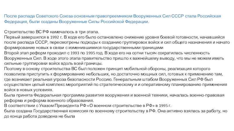 Слайд 46После распада Советского Союза основным правопреемником Вооруженных Сил СССР стала Российская