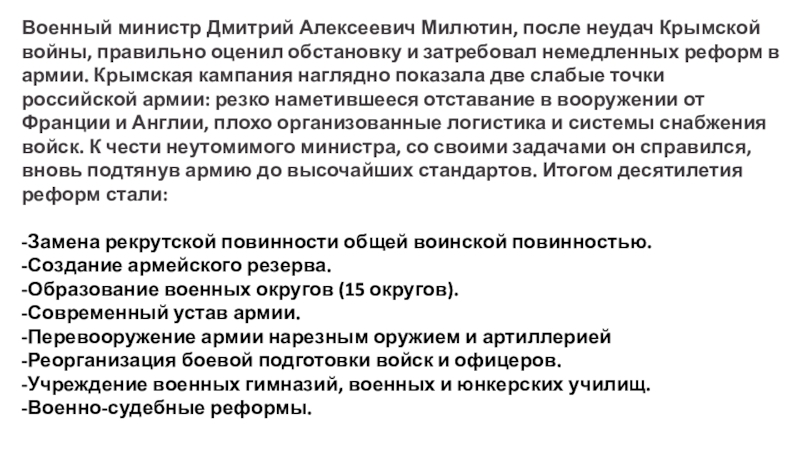 Слайд 18Военный министр Дмитрий Алексеевич Милютин, после неудач Крымской войны, правильно оценил