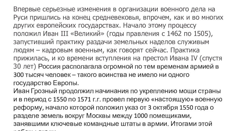 конец средневековья, впрочем, как и во многих других европейских государствах. Начало этому процессу положил Иван III «Великий» (годы правления с 1462 по 1505), запустивший практику раздачи земельных наделов служивым людям – кадровым военным, как говорят сейчас. Практика прижилась, и ко времени вступления на престол Ивана IV (спустя 30 лет) Россия располагала огромной по тем временам армией в 300 тысяч человек – такого воинства не имело ни одного государство Европы.