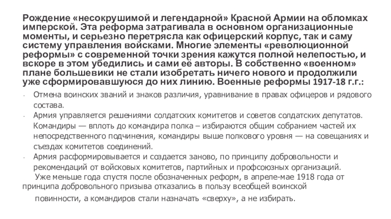 Слайд 24Рождение «несокрушимой и легендарной» Красной Армии на обломках имперской. Эта реформа