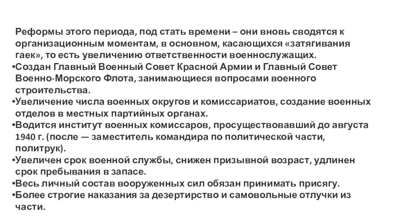Слайд 28Военная реформа включала в себя мероприятия по перестройке и укреплению Вооруженных
