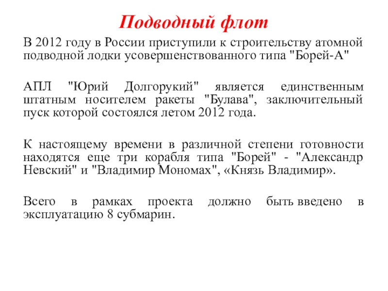 АПЛ "Юрий Долгорукий" является единственным штатным носителем ракеты "Булава", заключительный пуск которой состоялся летом 2012 года.