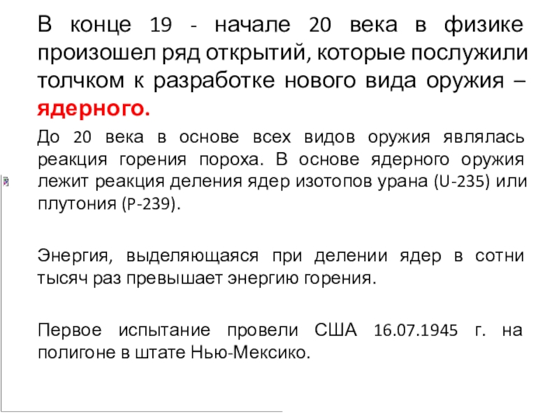 открытий, которые послужили толчком к разработке нового вида оружия – ядерного.