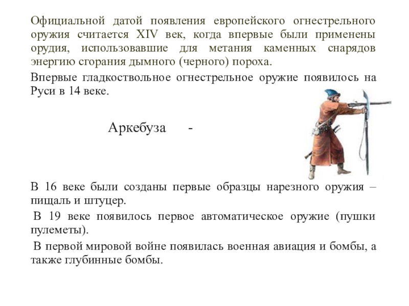 Слайд 3Официальной датой появления европейского огнестрельного оружия считается XIV век, когда впервые