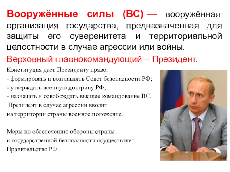 Слайд 7Вооружённые силы (ВС) — вооружённая организация государства, предназначенная для защиты его суверенитета