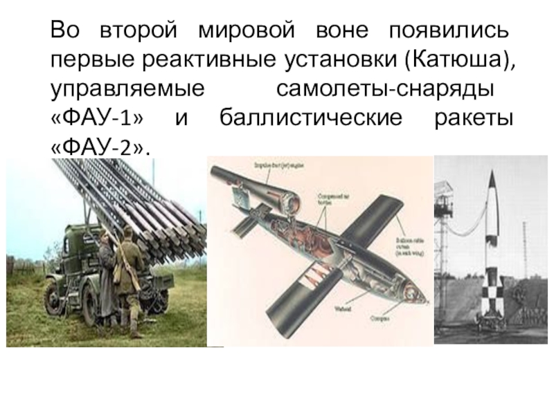 Слайд 4Во второй мировой воне появились первые реактивные установки (Катюша), управляемые самолеты-снаряды