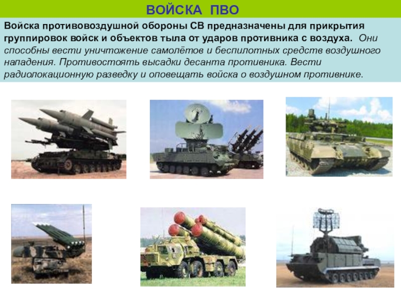 Войска противовоздушной обороны СВ предназначены для прикрытия группировок войск и объектов тыла от ударов противника с воздуха. Они способны вести уничтожение самолётов и беспилотных средств воздушного нападения. Противостоять высадки десанта противника. Вести радиолокационную разведку и оповещать войска о воздушном противнике.