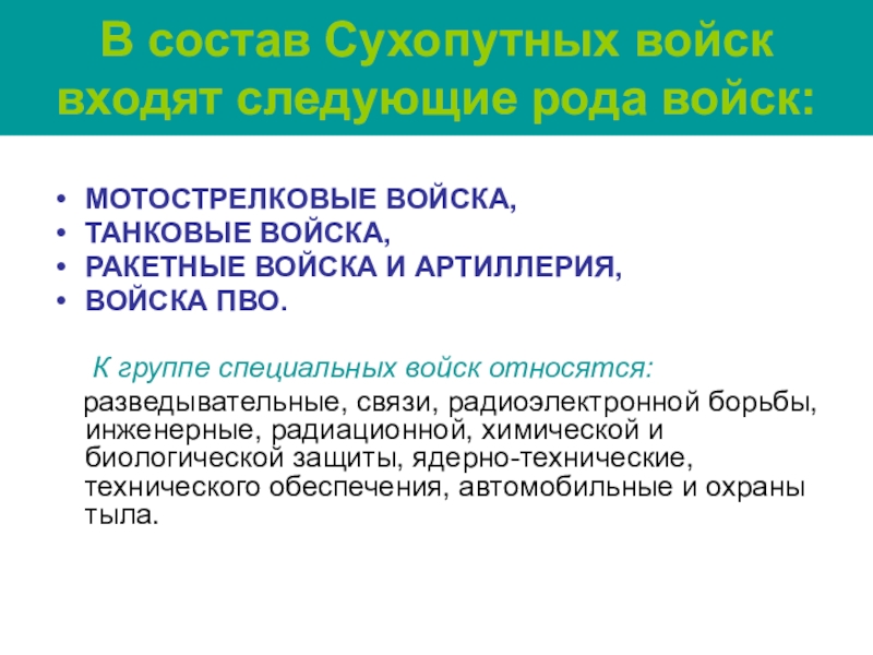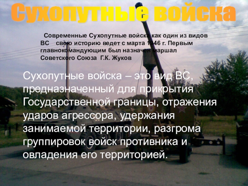 Современные Сухопутные войска как один из видов ВС свою историю ведет с марта 1946 г. Первым главнокомандующим был назначен маршал Советского Союза Г.К. Жуков