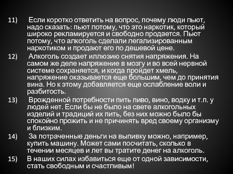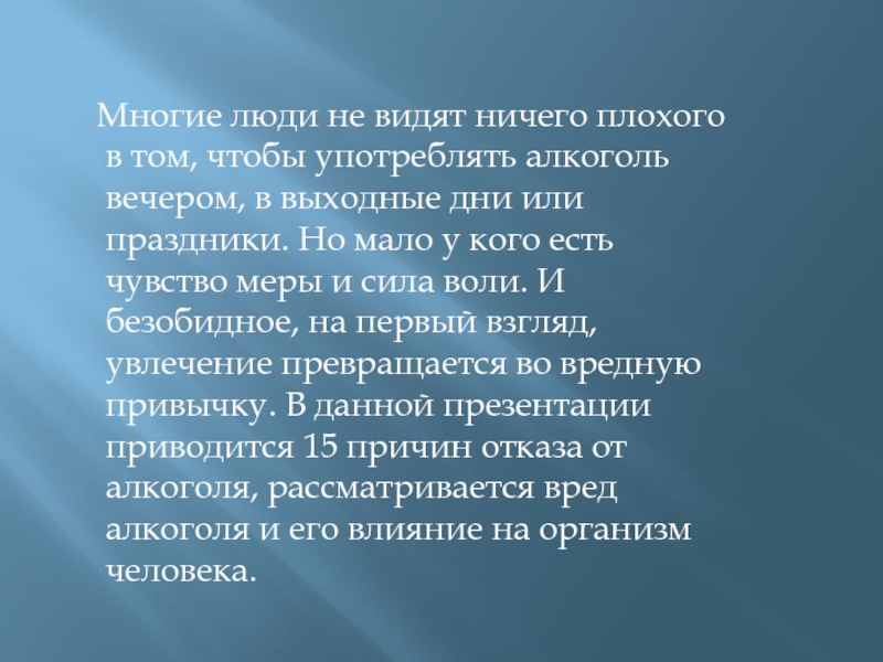 вечером, в выходные дни или праздники. Но мало у кого есть чувство меры и сила воли. И безобидное, на первый взгляд, увлечение превращается во вредную привычку. В данной презентации приводится 15 причин отказа от алкоголя, рассматривается вред алкоголя и его влияние на организм человека.