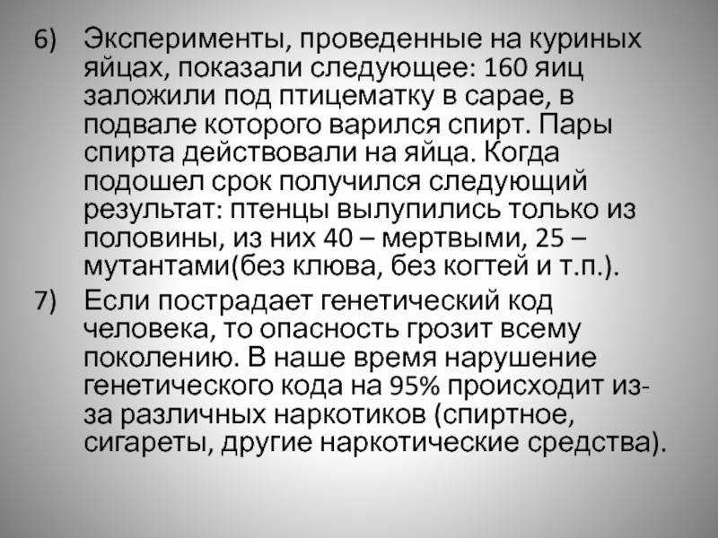 птицематку в сарае, в подвале которого варился спирт. Пары спирта действовали на яйца. Когда подошел срок получился следующий результат: птенцы вылупились только из половины, из них 40 – мертвыми, 25 – мутантами(без клюва, без когтей и т.п.).
