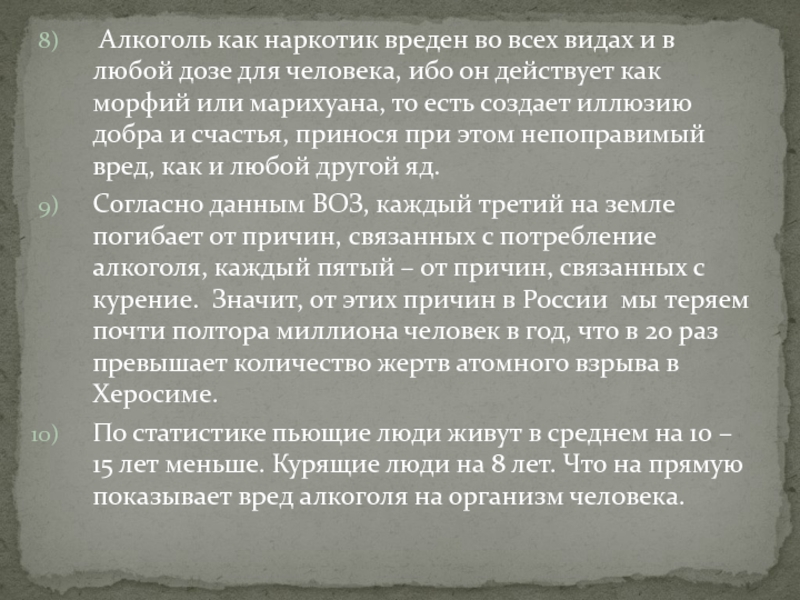 Согласно данным ВОЗ, каждый третий на земле погибает от причин, связанных с потребление алкоголя, каждый пятый – от причин, связанных с курение. Значит, от этих причин в России мы теряем почти полтора миллиона человек в год, что в 20 раз превышает количество жертв атомного взрыва в Херосиме.