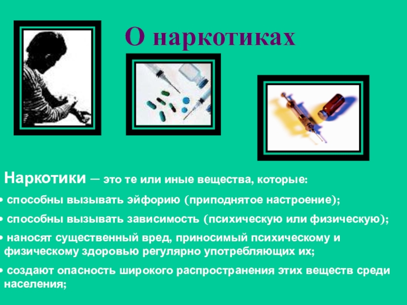 Состояние, развивающееся в результате употребления наркотиков; приводит к химической зависимости организма
