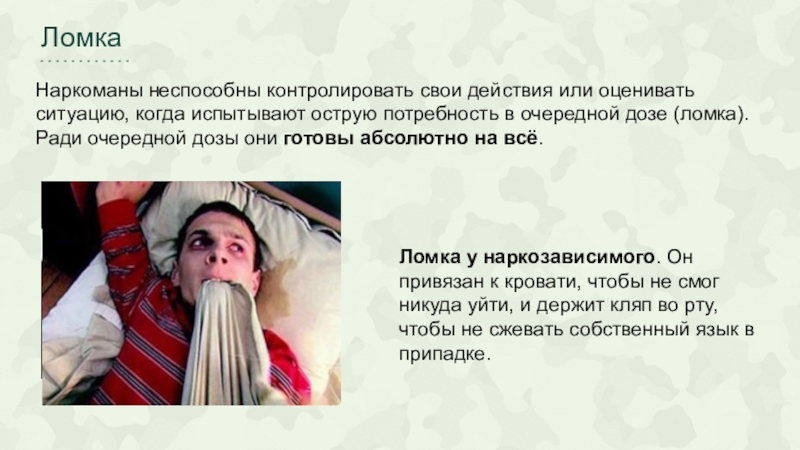 Ломка у наркозависимого. Он привязан к кровати, чтобы не смог никуда уйти, и держит кляп во рту, чтобы не сжевать собственный язык в припадке.