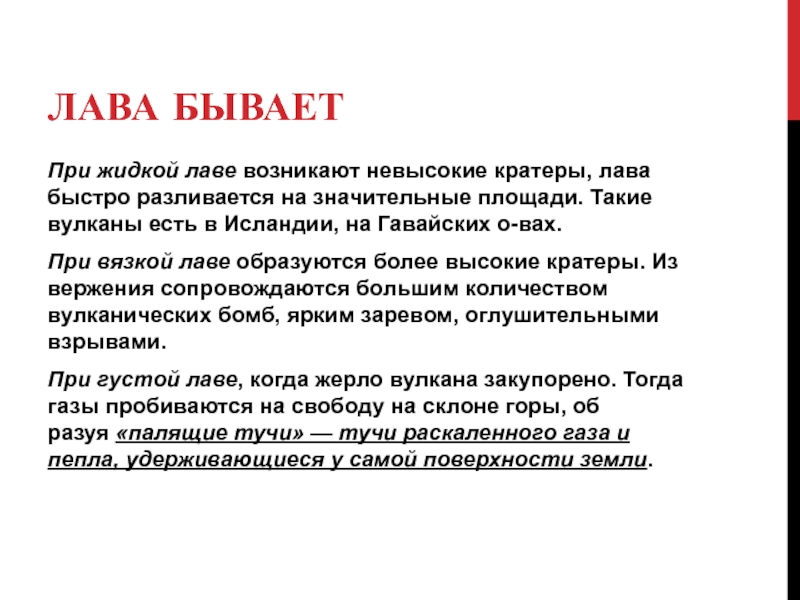 При густой лаве, когда жерло вулкана закупорено. Тогда газы пробиваются на свободу на склоне горы, образуя «палящие тучи» — тучи раскаленного газа и пепла, удерживающиеся у самой поверхности земли.