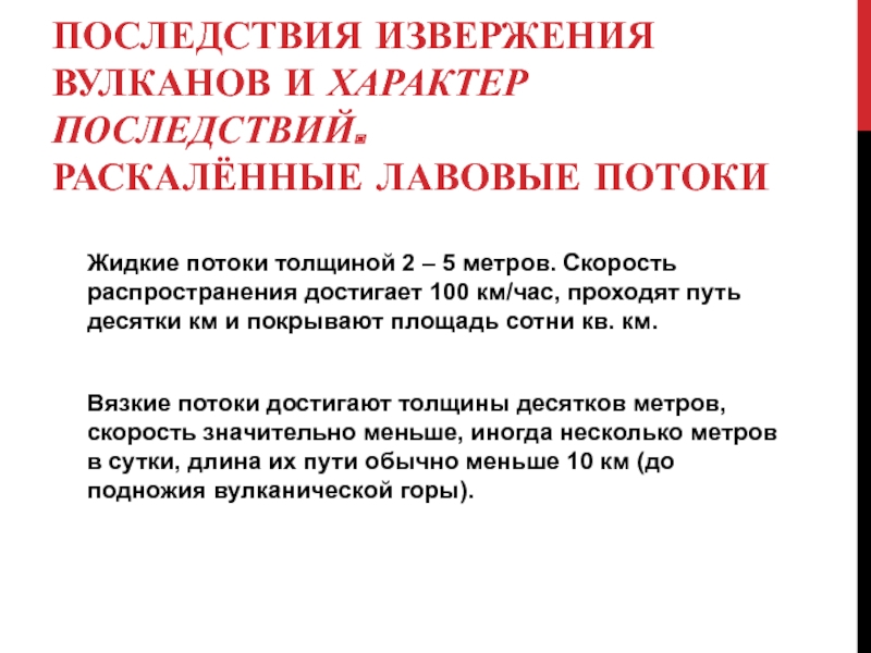 Вязкие потоки достигают толщины десятков метров, скорость значительно меньше, иногда несколько метров в сутки, длина их пути обычно меньше 10 км (до подножия вулканической горы).