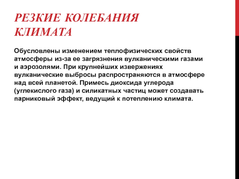 газами и аэрозолями. При крупнейших извержениях вулканические выбросы распространяются в атмосфере над всей планетой. Примесь диоксида углерода (углекислого газа) и силикатных частиц может создавать парниковый эффект, ведущий к потеплению климата.