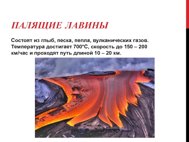 Состоят из глыб, песка, пепла, вулканических газов. Температура достигает 700*С,