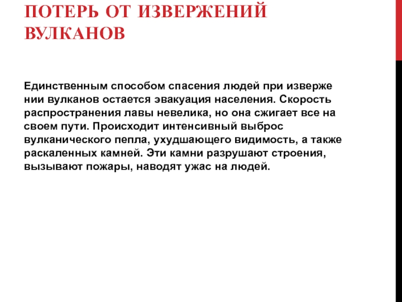 извержении вулканов остается эвакуация населения. Скорость распространения лавы невелика, но она сжигает все на своем пути. Происходит интенсивный выброс вулканического пепла, ухудшающего видимость, а также раскаленных камней. Эти камни разрушают строения, вызывают пожары, наводят ужас на людей.