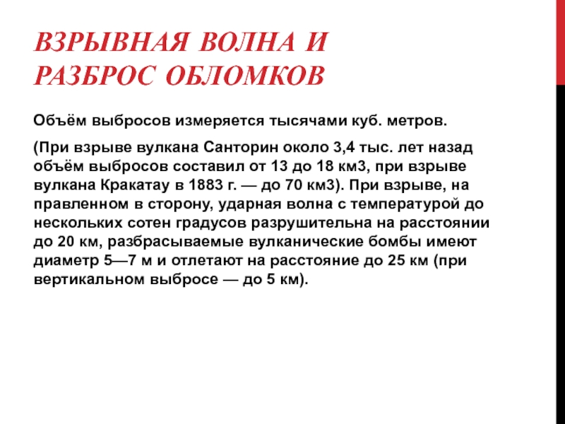 вулкана Санторин около 3,4 тыс. лет назад объём выбросов составил от 13 до 18 км3, при взрыве вулкана Кракатау в 1883 г. — до 70 км3). При взрыве, направленном в сторону, ударная волна с температурой до нескольких сотен градусов разрушительна на расстоянии до 20 км, разбрасываемые вулканические бомбы имеют диаметр 5—7 м и отлетают на расстояние до 25 км (при вертикальном выбросе — до 5 км).