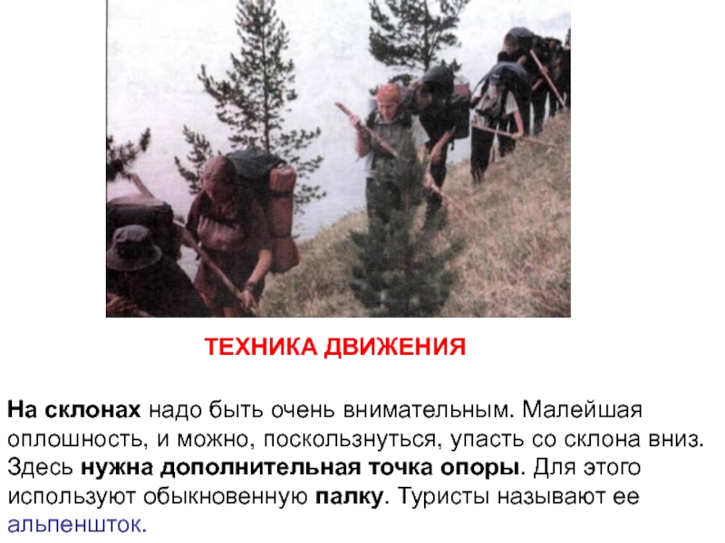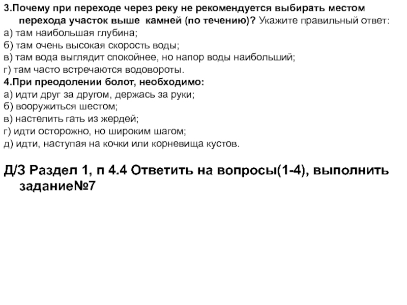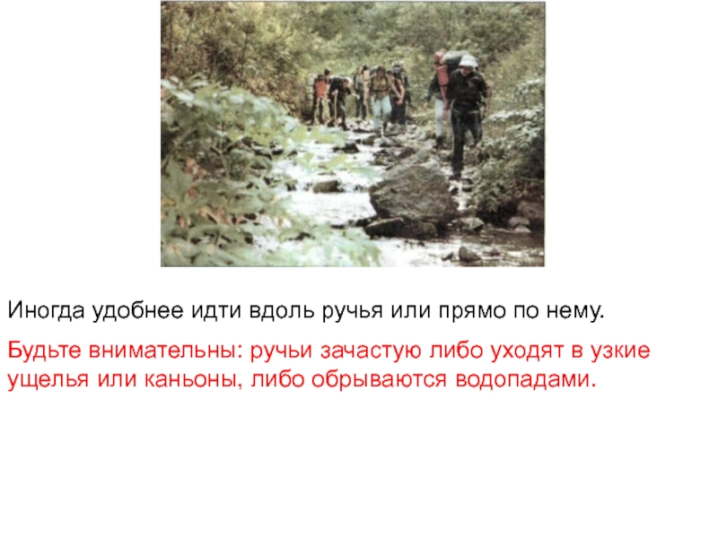 Если на реке есть камни, то не выбирайте местом перехода участка выше камней (по течению). Там вода выглядит спокойнее, но напор воды наибольший. Если вы один, используйте для перехода альпеншток. Ставьте его при переходе выше себя относительно течения и опирайтесь на него.