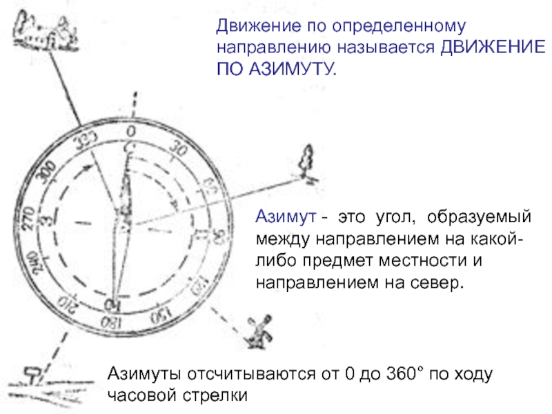Азимуты отсчитываются от 0 до 360° по ходу часовой стрелки