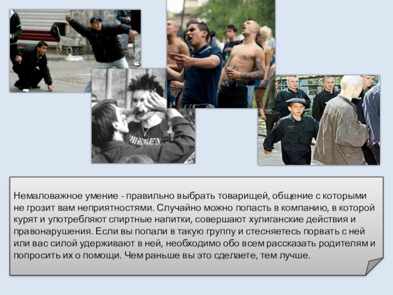 грозит вам неприятностями. Случайно можно попасть в компанию, в которой курят и употребляют спиртные напитки, совершают хулиганские действия и правонарушения. Если вы попали в такую группу и стесняетесь порвать с ней или вас силой удерживают в ней, необходимо обо всем рассказать родителям и попросить их о помощи. Чем раньше вы это сделаете, тем лучше.