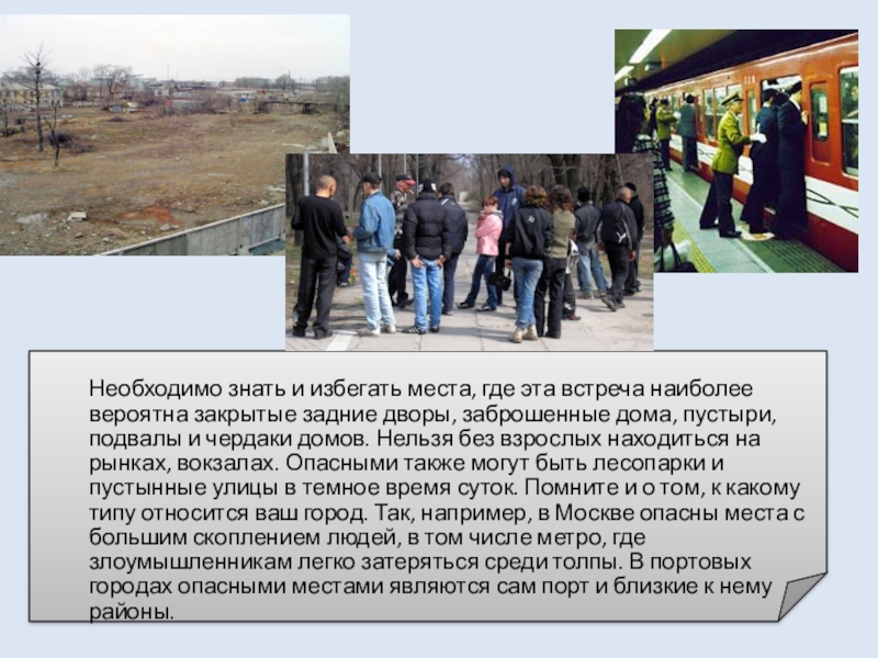 задние дворы, заброшенные дома, пустыри, подвалы и чердаки домов. Нельзя без взрослых находиться на рынках, вокзалах. Опасными также могут быть лесопарки и пустынные улицы в темное время суток. Помните и о том, к какому типу относится ваш город. Так, например, в Москве опасны места с большим скоплением людей, в том числе метро, где злоумышленникам легко затеряться среди толпы. В портовых городах опасными местами являются сам порт и близкие к нему районы.