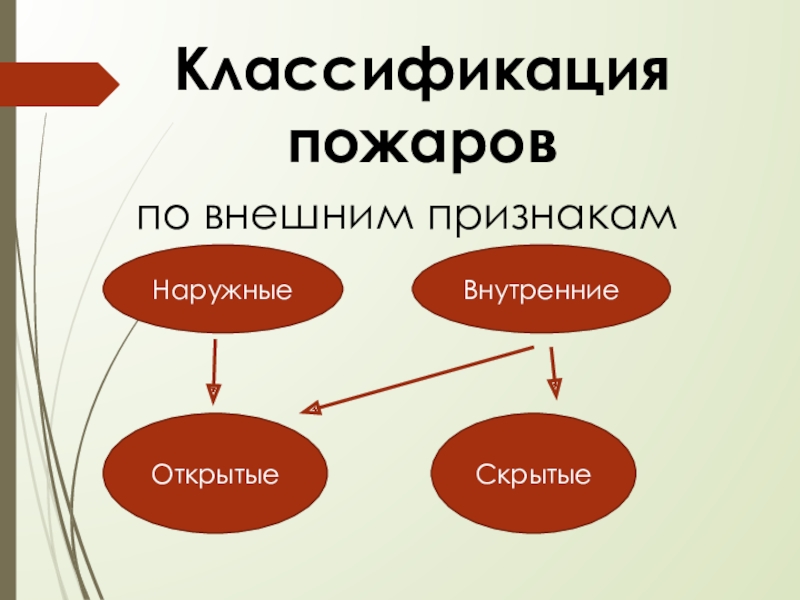 Классификация пожаровпо внешним признакамНаружные ВнутренниеОткрытые Скрытые