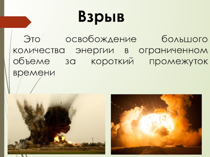 Взрыв	Это освобождение большого количества энергии в ограниченном объеме за короткий промежуток времени