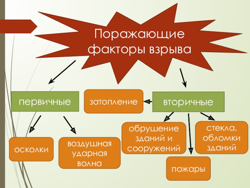 Поражающие факторы взрывапервичныевторичныеосколкивоздушная ударная волнаобрушение зданий и сооруженийстекла, обломки зданийпожарызатопление
