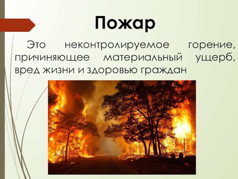 Слайд 11 Это неконтролируемое горение, причиняющее материальный ущерб, вред жизни и здоровью граждан