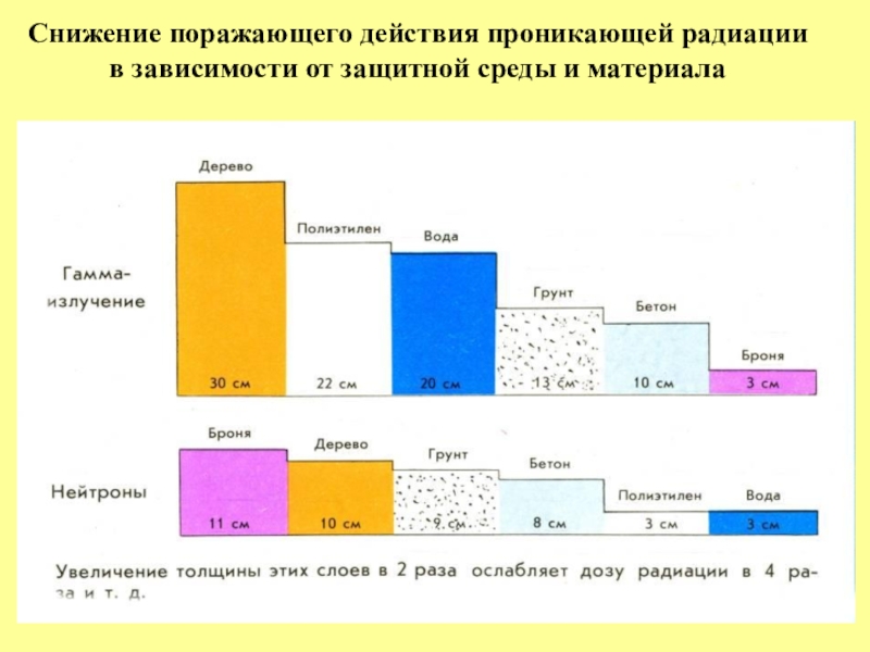 Чтобы оценить влияние различных видов ионизирующих излучений на человека (животное), надо учитывать две их основные характеристики: ионизирующую и проникающую способности. Альфа-излучение обладает высокой ионизирующей, но слабой проникающей способностью. Так, например, даже обыкновенная одежда защищает человека от этого вида излучения. Однако, попадание альфа-частиц внутрь организма с воздухом, водой и пищей уже очень опасно. Бета-излучение имеет меньшую ионизирующую способность, чем альфа-излучение, но большую проникающую способность. Здесь для защиты нужно использовать любое укрытие. И, наконец, гамма- и нейтронное излучения обладают очень высокой проникающей способностью.