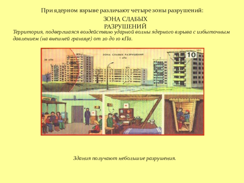 Здания и сооружения получают средние разрушения. Убежища и укрытия подвального типа сохраняются.