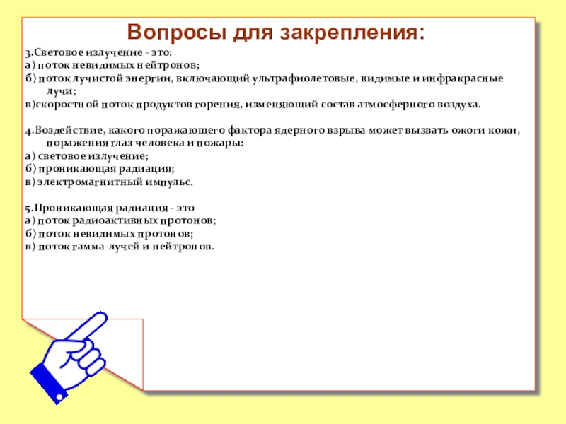 Световое излучение ядерного взрыва очень сильное, оно вызывает ожоги и временное ослепление. В зависимости от тяжести поражения ожоги делятся на четыре степени: первая —покраснение, припухлость и болезненность кожи; вторая —образование пузырей; третья — омертвление кожных покровов и тканей; четвертая — обугливание кожи.