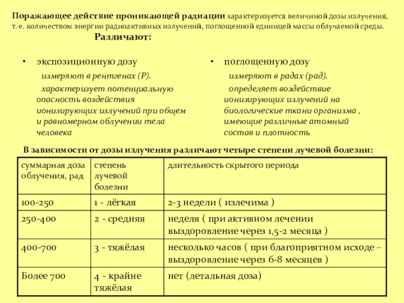 В зависимости от дозы излучения различают четыре степени лучевой болезни: