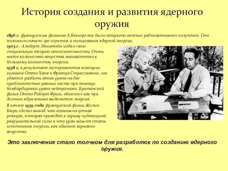 В начале 1939 года французский физик Жолио-Кюри сделал вывод, что возможна цепная реакция, которая приведет к взрыву чудовищной разрушительной силы и что уран может стать источником энергии, как обычное взрывное вещество.