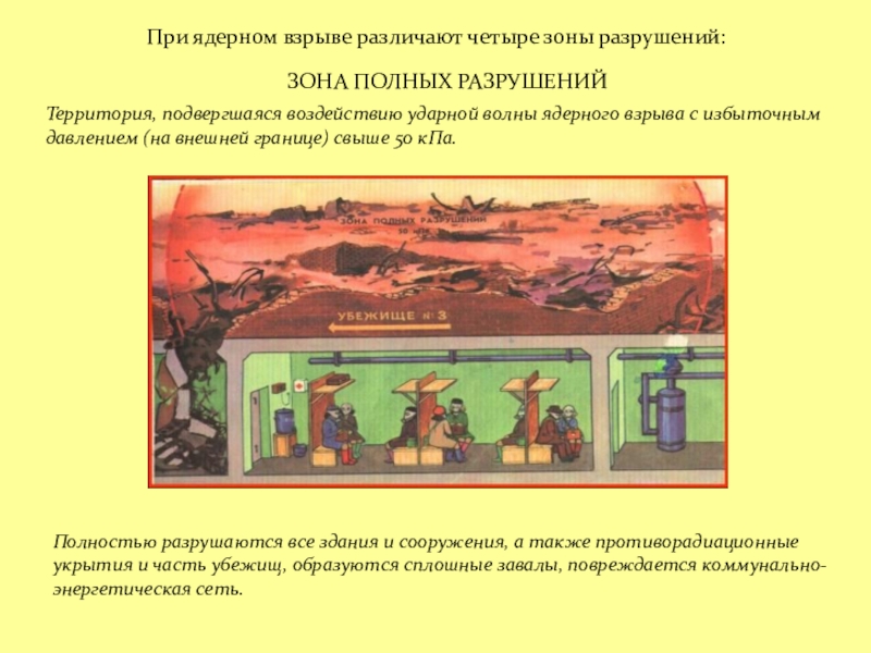 Полностью разрушаются все здания и сооружения, а также противорадиационные укрытия и часть убежищ, образуются сплошные завалы, повреждается коммунально-энергетическая сеть.