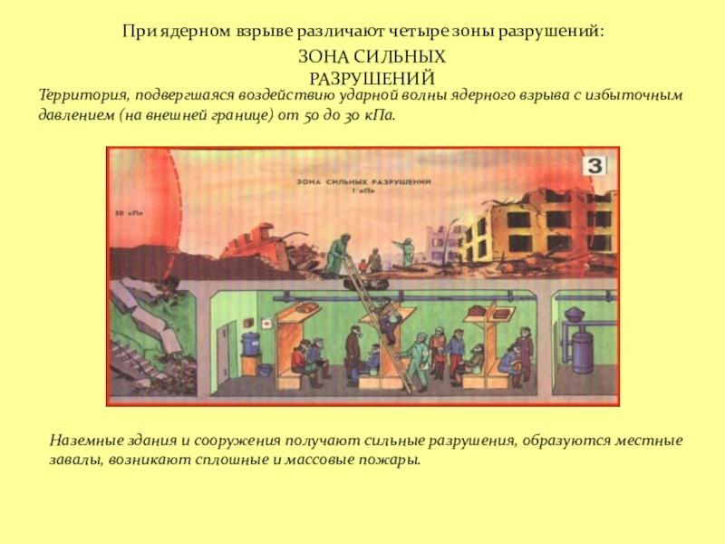 Наземные здания и сооружения получают сильные разрушения, образуются местные завалы, возникают сплошные и массовые пожары.