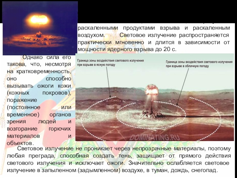 Световое излучение не проникает через непрозрачные материалы, поэтому любая преграда, способная создать тень, защищает от прямого действия светового излучения и исключает ожоги. Значительно ослабляется световое излучение в запыленном (задымленном) воздухе, в туман, дождь, снегопад.