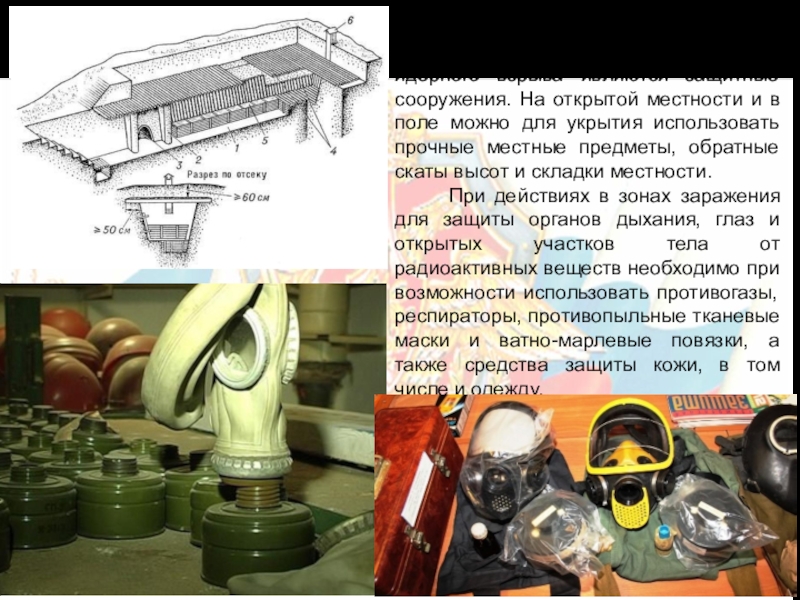 Надежной защитой от радиоактивно заражения являются защитные сооружения (убежища, перекрытые щели, подвальные помещения производственных и жилых зданий и др.), индивидуальные средства защиты (противогазы, респираторы, противопыльные тканевые маски и ватно-марлевые повязки, обычная одежда и обувь).