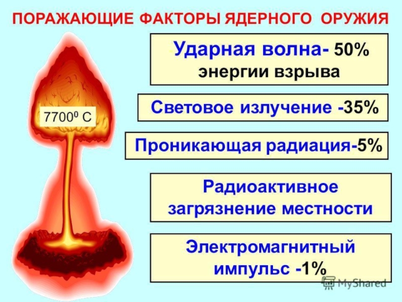 Основные поражающие факторы ядерного оружия: УДАРНАЯ ВОЛНА, СВЕТОВОЕ ИЗЛУЧЕНИЕ, ПРОНИКАЮЩАЯ РАДИАЦИЯ, РАДИОАКТИВНОЕ ЗАРАЖЕНИЕ, ЭЛЕКТРОМАГНИТНЫЙ ИМПУЛЬС.