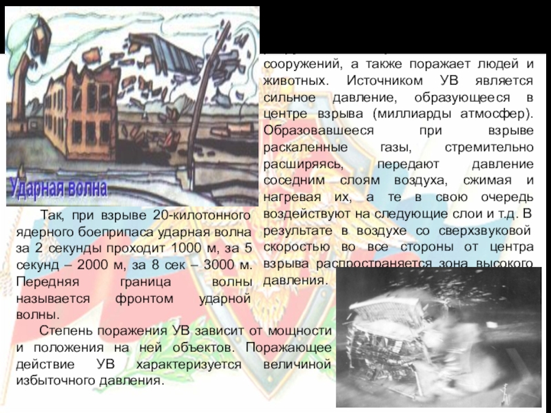 Степень поражения УВ зависит от мощности и положения на ней объектов. Поражающее действие УВ характеризуется величиной избыточного давления.