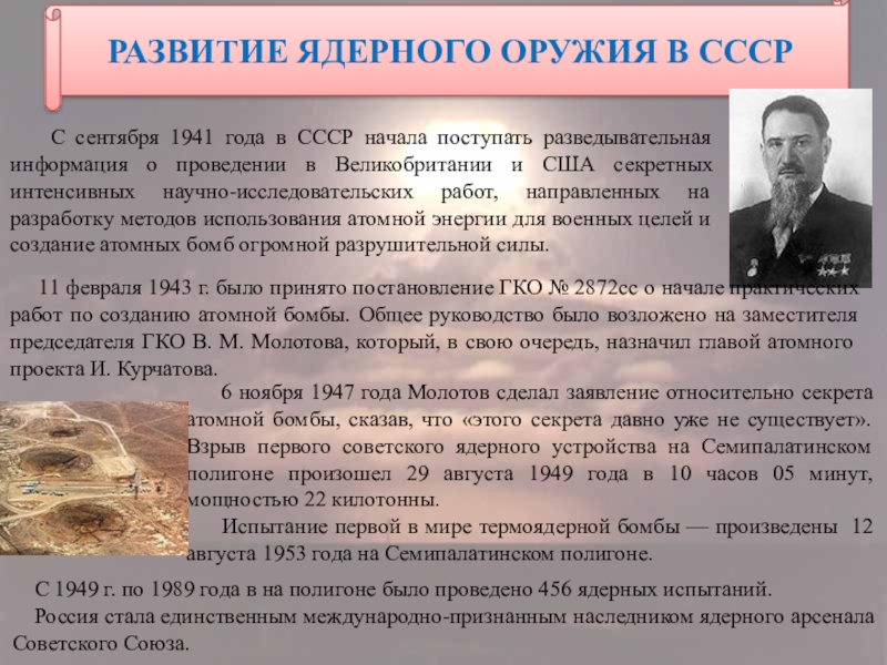 6 ноября 1947 года Молотов сделал заявление относительно секрета атомной бомбы, сказав, что «этого секрета давно уже не существует». Взрыв первого советского ядерного устройства на Семипалатинском полигоне произошел 29 августа 1949 года в 10 часов 05 минут, мощностью 22 килотонны.