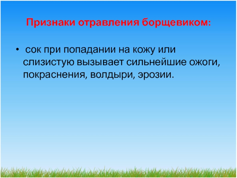 Сок при попадании на кожу вызывает покраснение, пузыри, при длительном воздействии – ожоги.