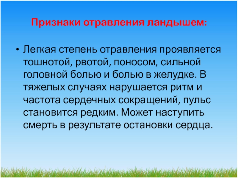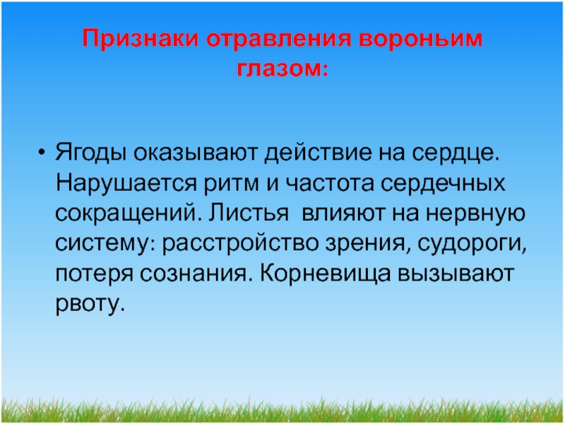 частота сердечных сокращений. Листья влияют на нервную систему: расстройство зрения, судороги, потеря сознания. Корневища вызывают рвоту.