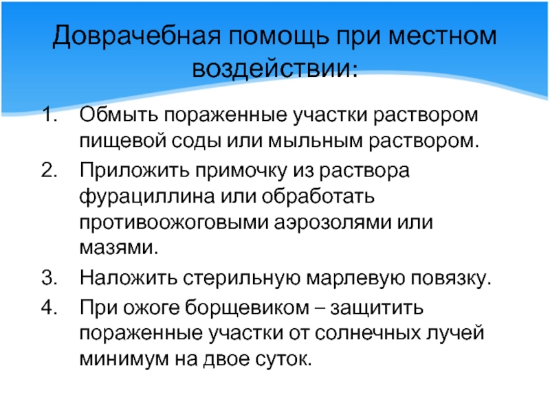 При ожоге борщевиком – защитить пораженные участки от солнечных лучей минимум на двое суток.
