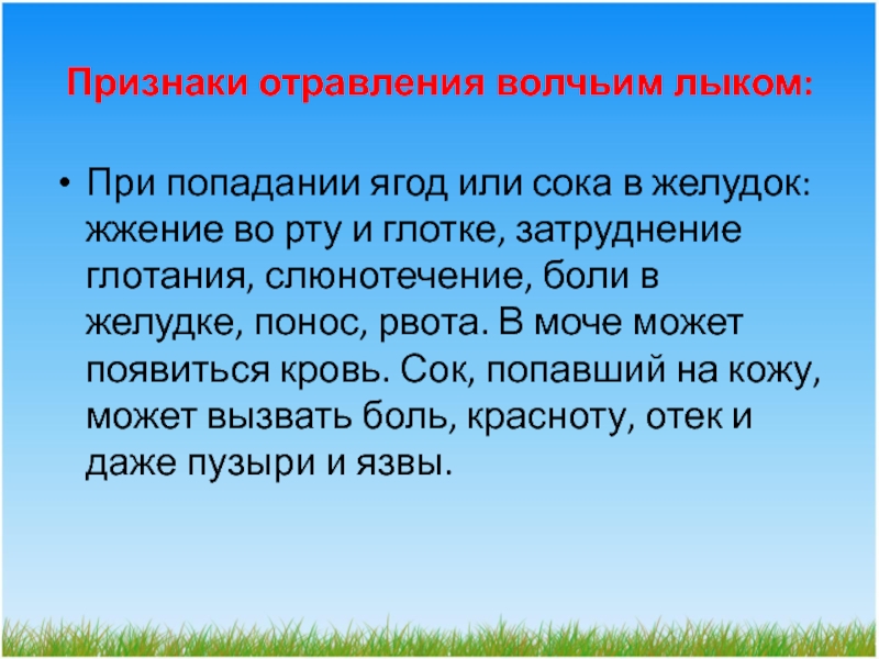 во рту и глотке, затруднение глотания, слюнотечение, боли в желудке, понос, рвота. В моче может появиться кровь. Сок, попавший на кожу, может вызвать боль, красноту, отек и даже пузыри и язвы.