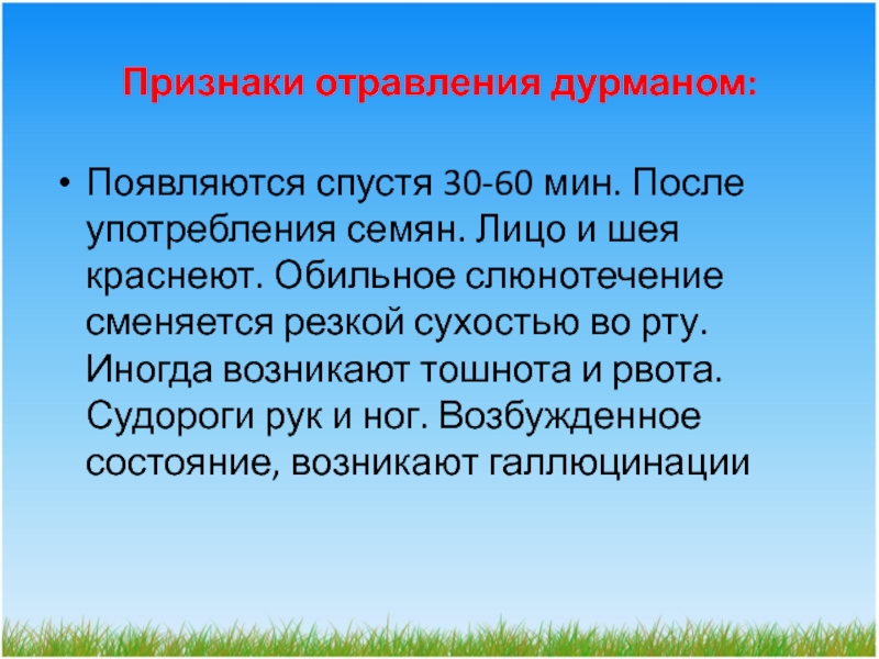 шея краснеют. Обильное слюнотечение сменяется резкой сухостью во рту. Иногда возникают тошнота и рвота. Судороги рук и ног. Возбужденное состояние, возникают галлюцинации