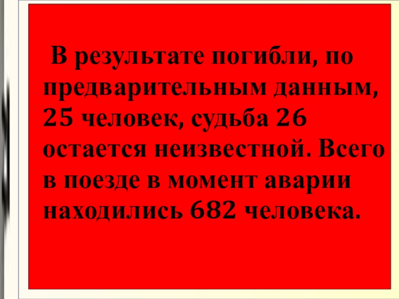 данным, 25 человек, судьба 26 остается неизвестной. Всего в поезде в момент аварии находились 682 человека.