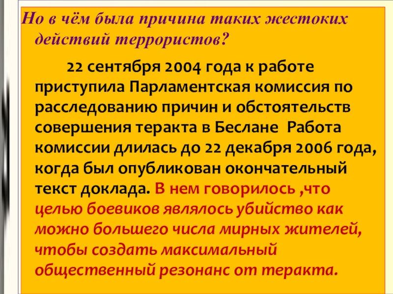 22 сентября 2004 года к работе приступила Парламентская комиссия по расследованию причин и обстоятельств совершения теракта в Беслане Работа комиссии длилась до 22 декабря 2006 года, когда был опубликован окончательный текст доклада. В нем говорилось ,что целью боевиков являлось убийство как можно большего числа мирных жителей, чтобы создать максимальный общественный резонанс от теракта.